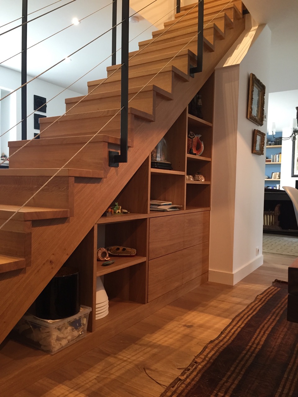 Exploitez chaque recoin de votre intérieur grâce à nos solutions d’aménagement sous-pente et sous-escalier. Nous concevons des rangements intelligents et esthétiques qui optimisent l’espace disponible tout en s’intégrant parfaitement à votre décoration.